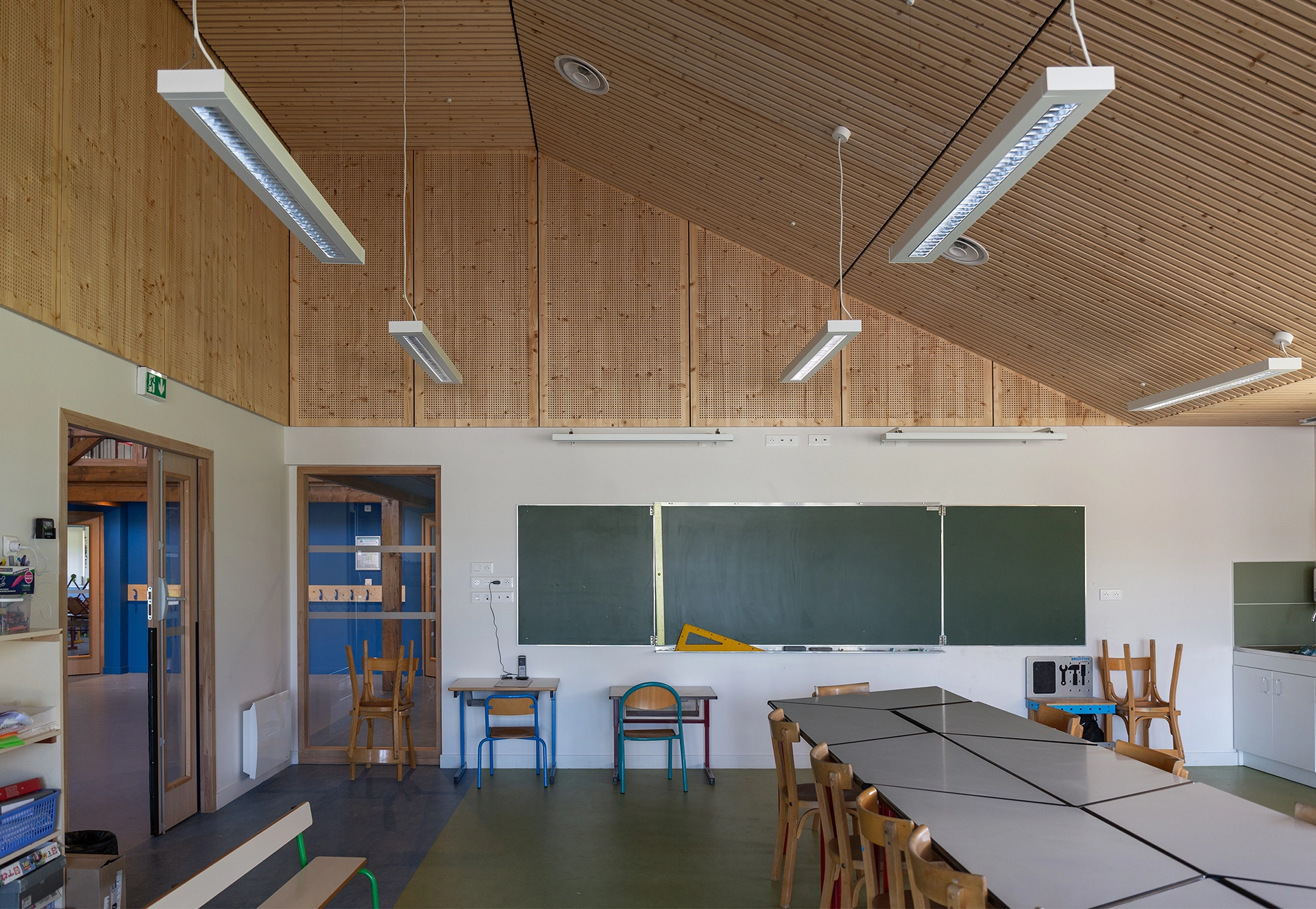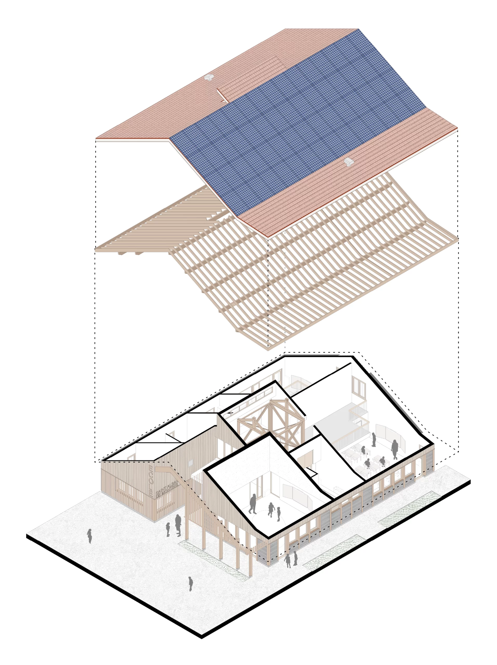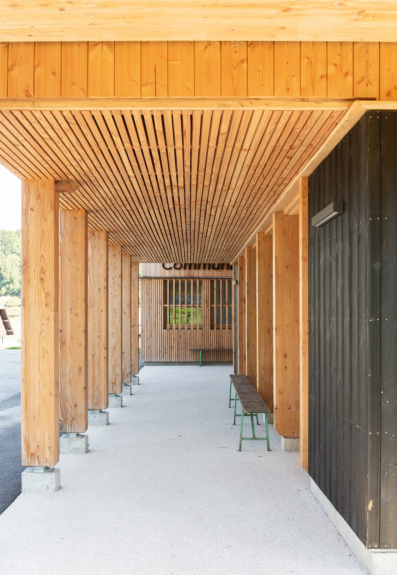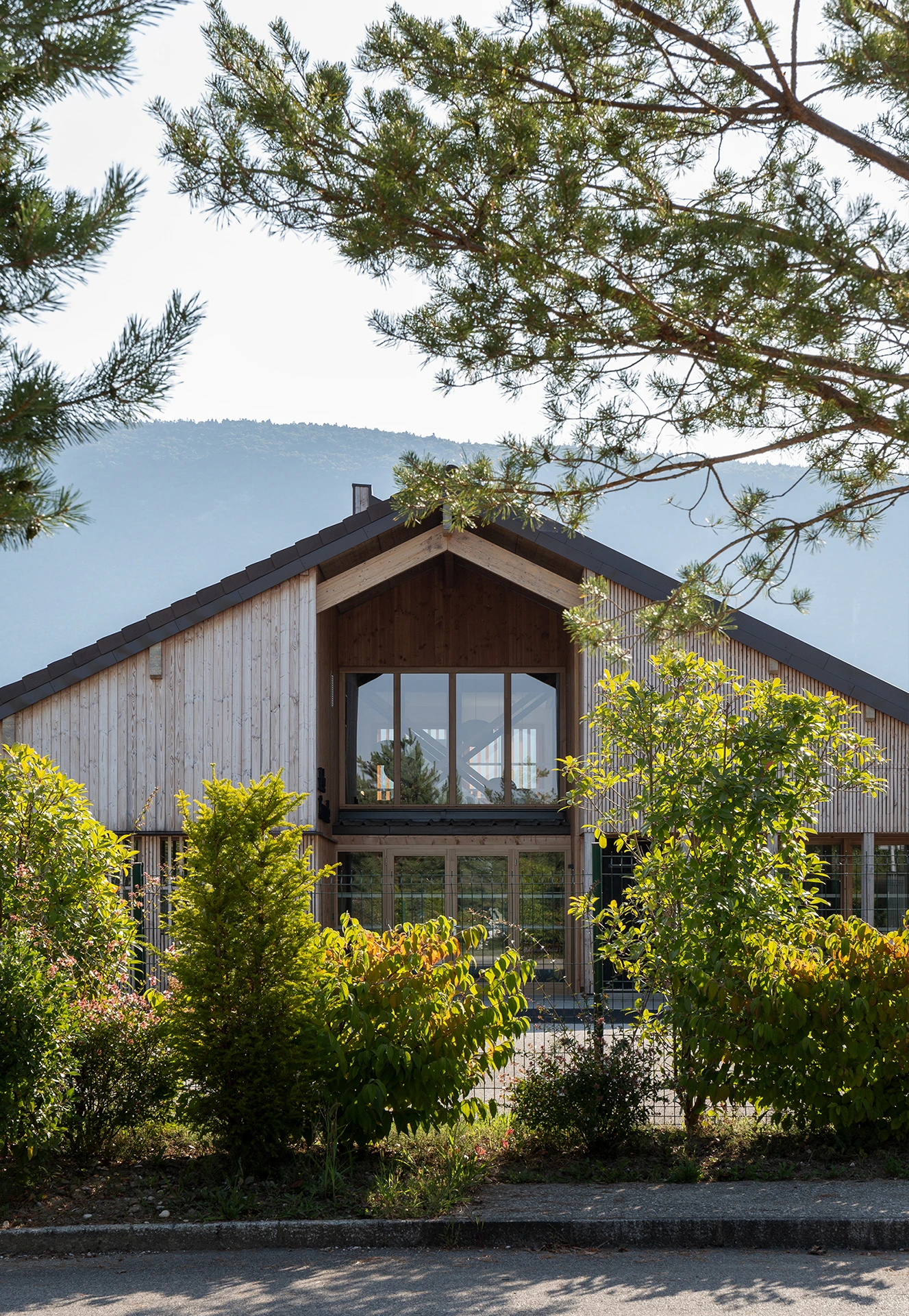 Nous avons opté pour une réhabilitation tout bois pour respecter la partie d’origine du bâtiment de 1985. Nous avons conservé un axe Est/Ouest ouvert au centre du bâtiment pour laisser la lumière entrer jusqu’à l’atrium central. Une grande casquette a été mise en œuvre au Sud pour protéger des surchauffes tout en gardant l’ouverture sur le village.