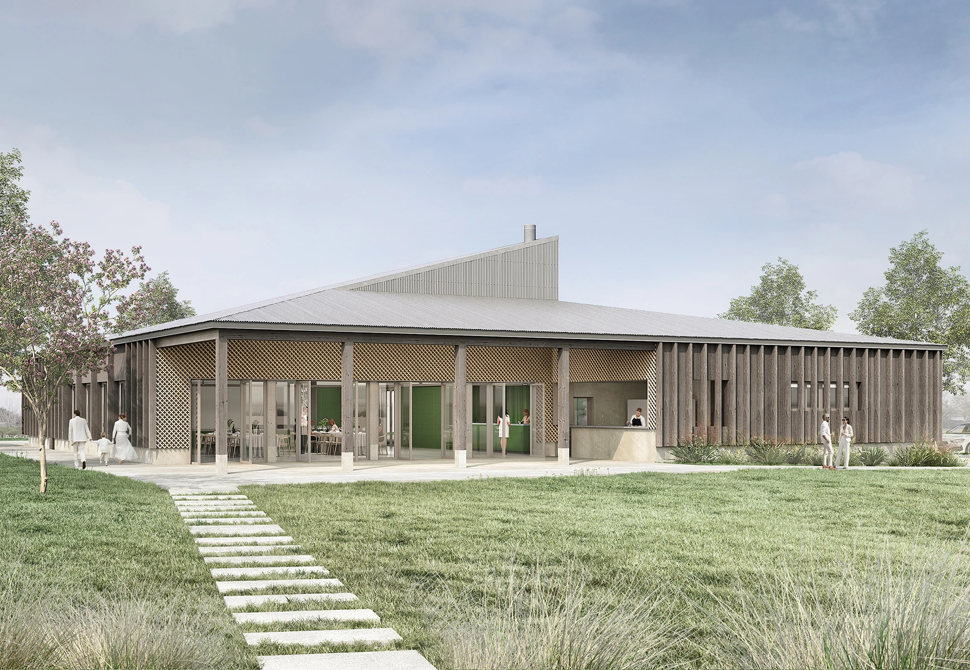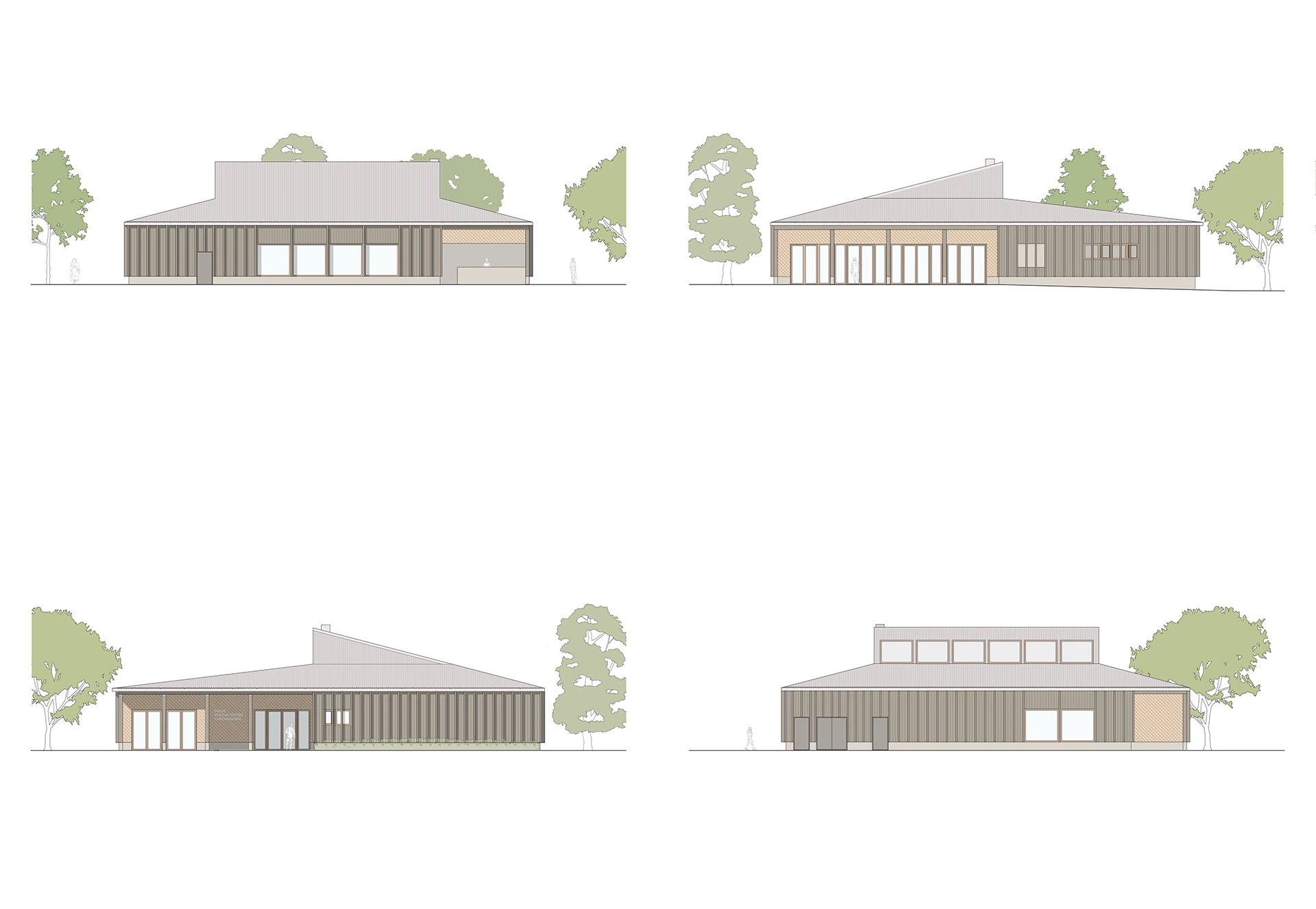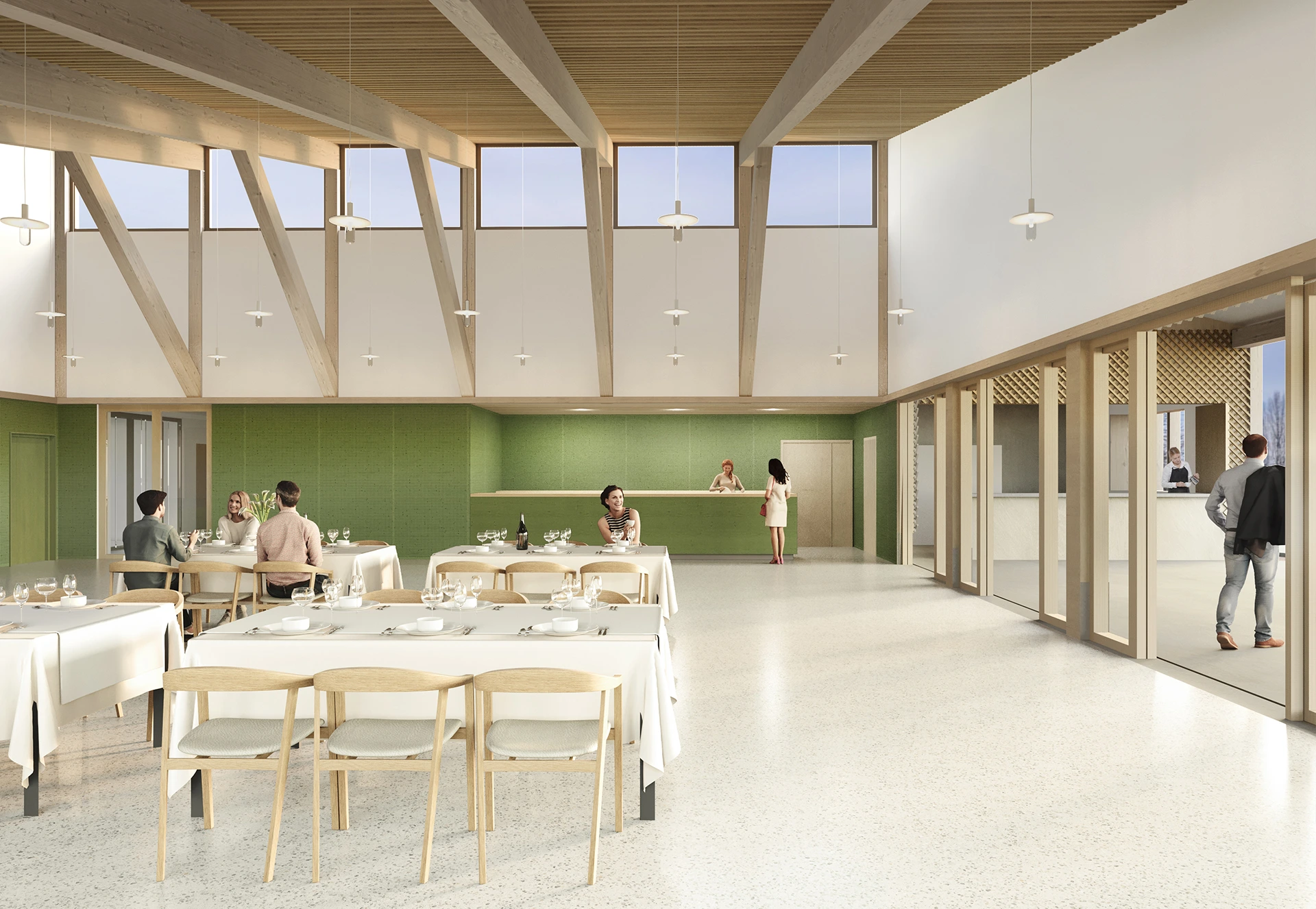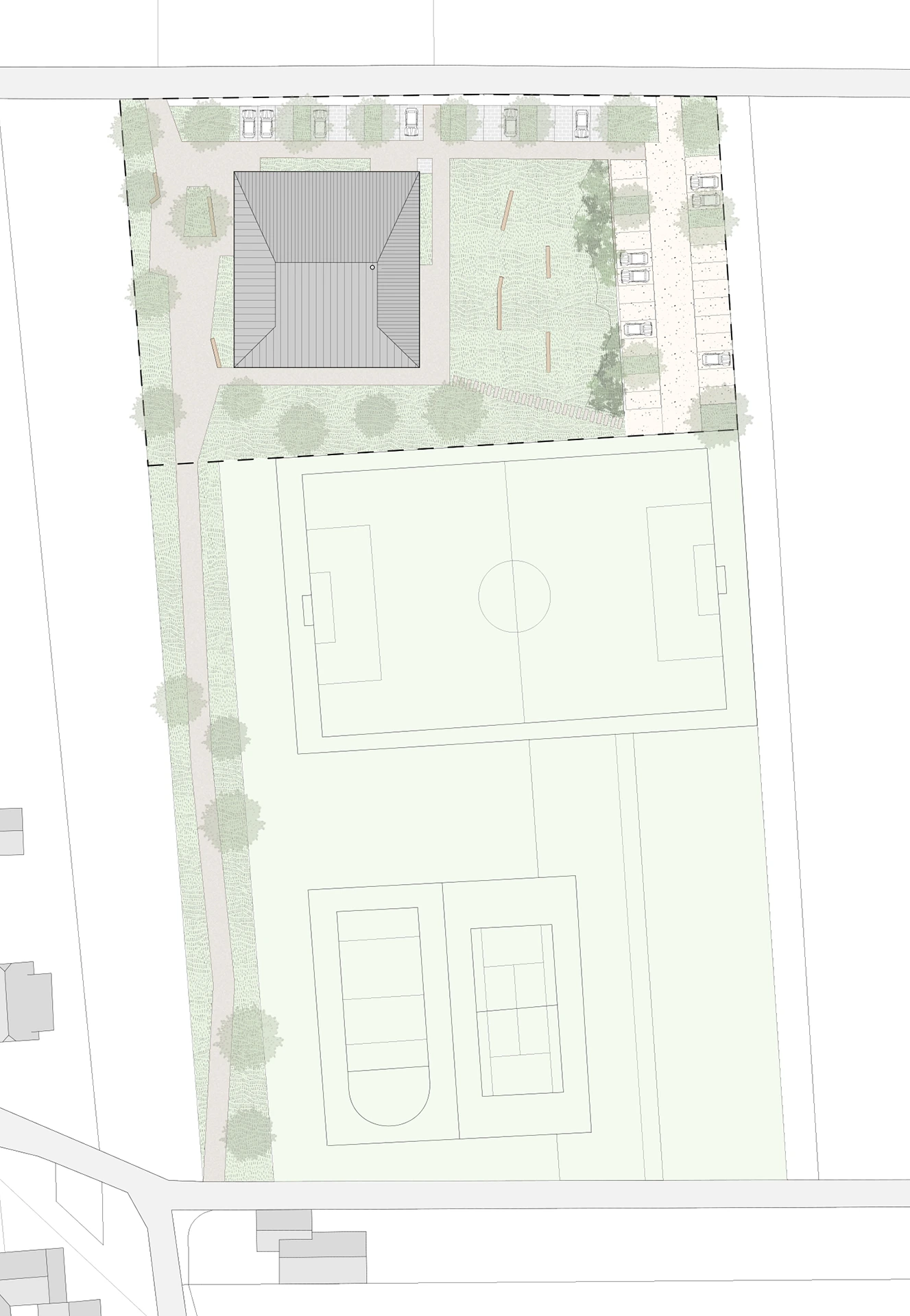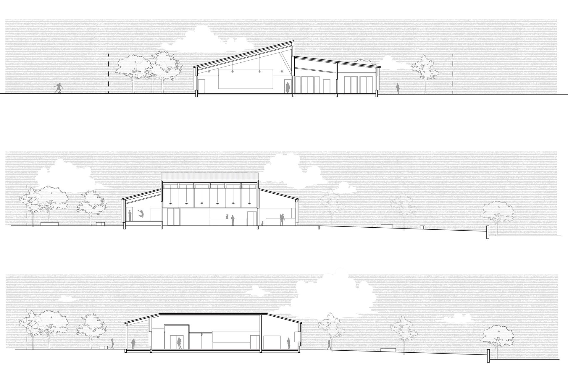Soulignant les espaces extérieurs, la volumétrie du bâtiment est marquée par le contraste entre les deux salles aux angles opposés et les volumes fermés de la scène et des locaux cuisine/rangements. Le volume est travaillé comme un monolithe creusé par les deux préaux ouverts. Le traitement de ces préaux permet de renforcer à la fois le sentiment d’intimité pour le parvis d’entrée, et le cadre privilégié pour la terrasse extérieure. Les vues proposées sont appropriées au caractère événementiel de l’usage de la salle festive.