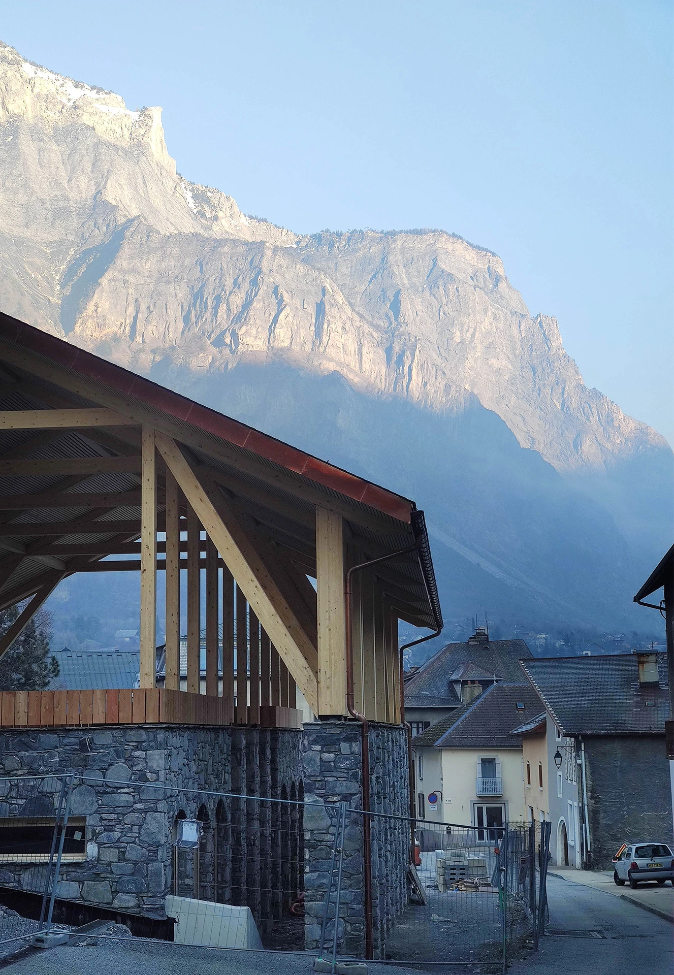 Pour répondre à cette demande, nous proposons un bâtiment en lien à la fois avec son contexte ainsi qu’avec le nouvel aménagement paysager. Puisque le parti principal d’implantation de la halle est son rapport avec l’espace public, nous profitons de la pente du terrain pour créer un grand espace public, aussi la création de commerces donnant sur la rue. Ce parti met également en évidence le grand paysage savoyard.
